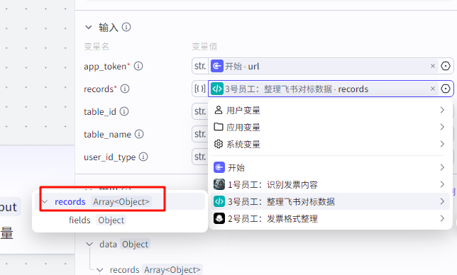 ![]() ![]() 输出要选择变量类型为“Array<Object>”,因为导入多维表格的数据只接受这个类型的变量