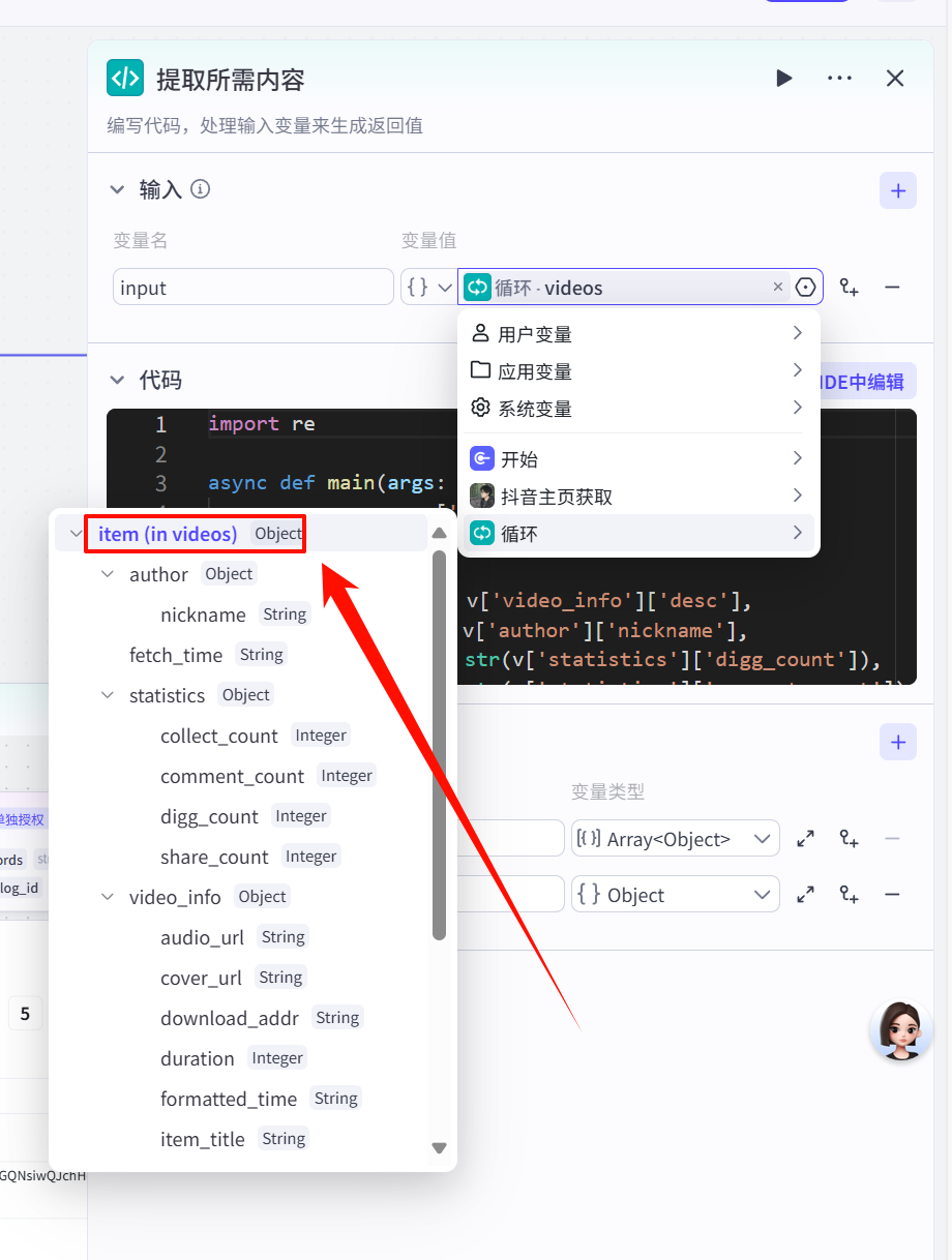 ![]() 输出要选择变量类型为“Array<Object>”,因为导入多维表格的数据只接受这个类型的变量