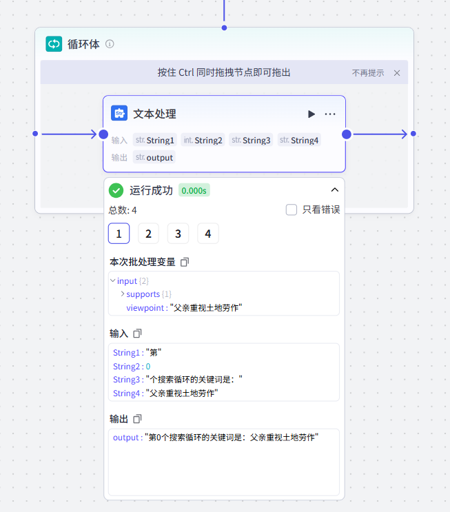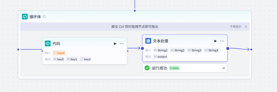 我们添加一个代码节点进入循环体,放置在文本处理节点的前面
