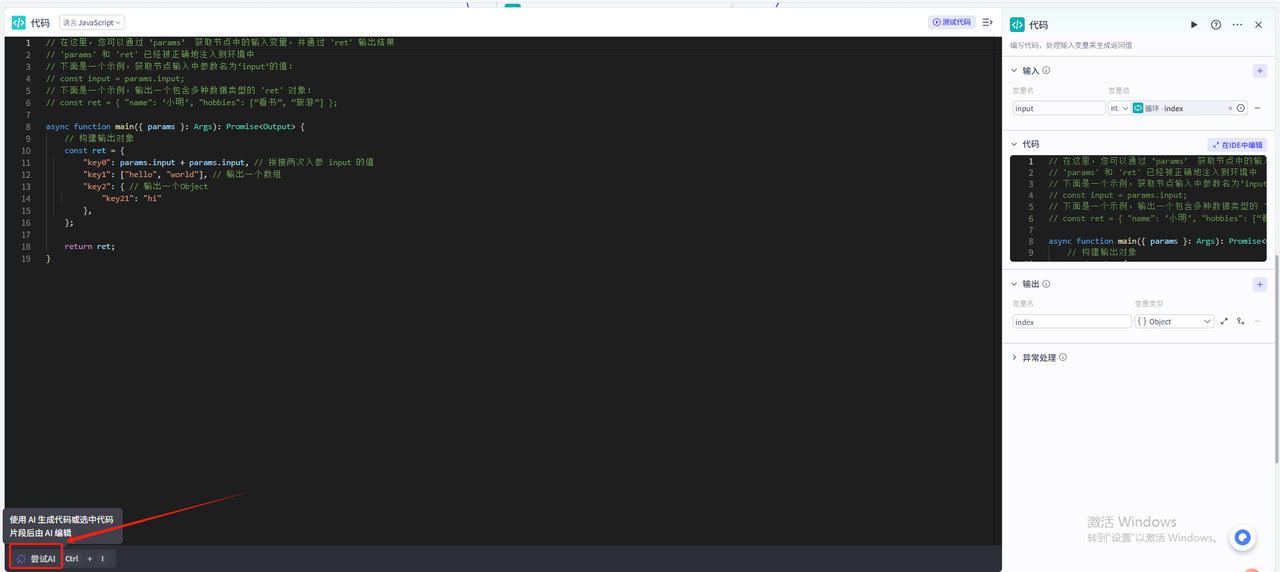接着Coze会出现一个很大的IDE代码编辑界面,我们可以看到左下角有一个尝试AI的按钮,这就是Coze中内置AI生成代码的入口