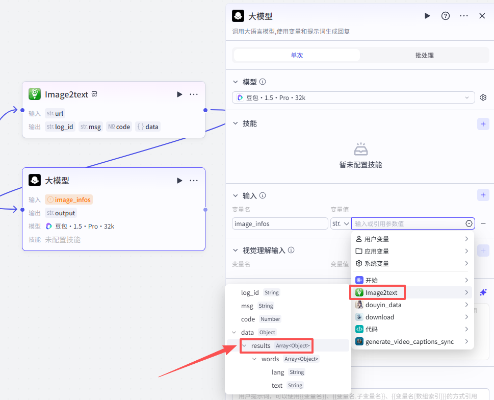 添加之后就是这样,把它和上一个大模型节点链接起来,这里需要配置一个参数