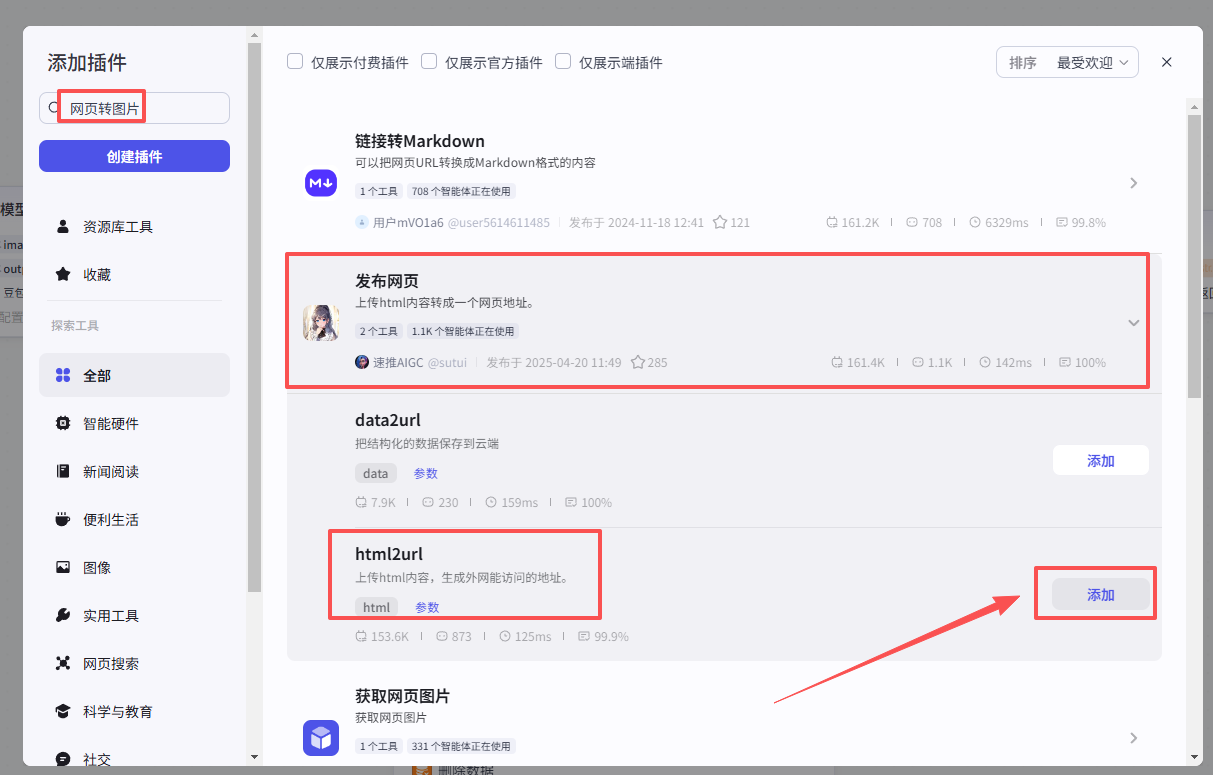 在输入框中输入发布网页,看到我们框选出来的这个插件,选择添加他的html2url接口