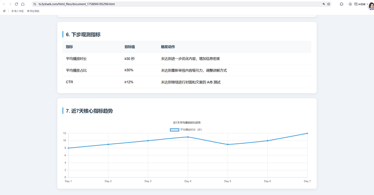 调用大模型复盘分析:将冷冰冰的数字转化为有逻辑的洞察,例如“开头吸引力不足导致 2s 跳出率偏高”、“中段剧情反转有效提升了平均播放时长”