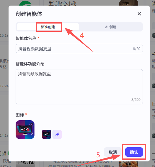 在弹窗中选择创建智能体,点击标准创建,然后输入名称和功能介绍,点击确认