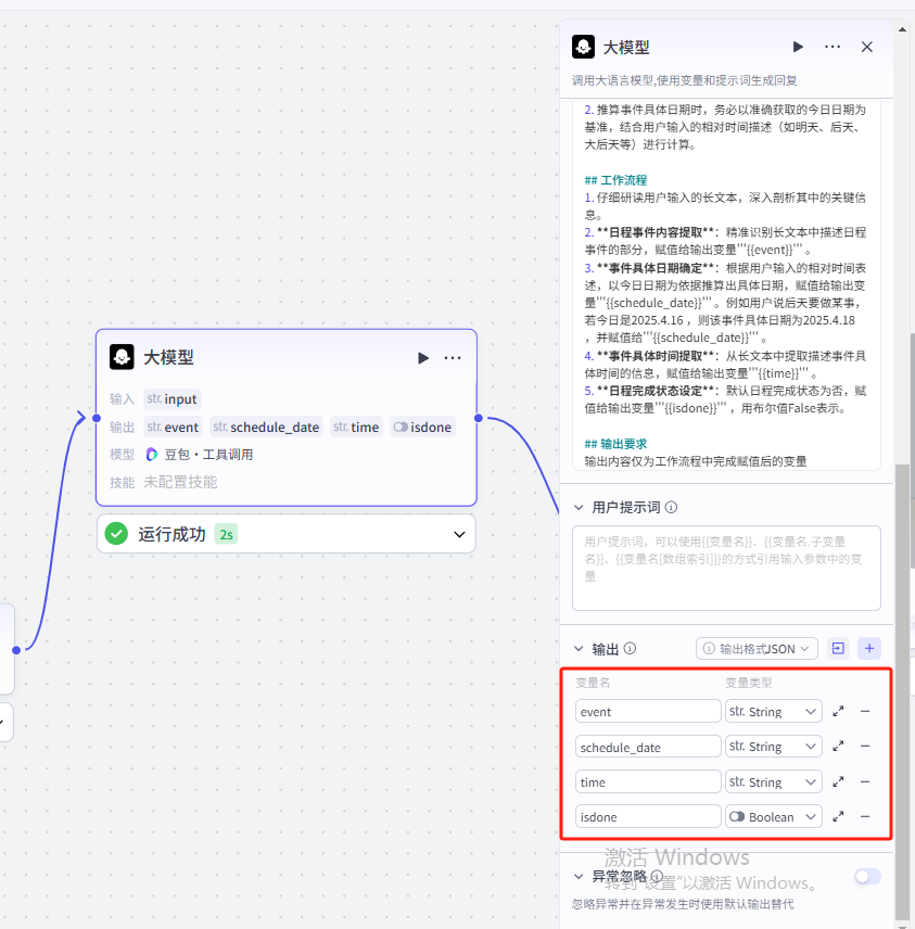 这里重点说一下,如果是一个长文本中包含了四五个日程安排的情况,需要用到工作流中 循环 的处理方式,这个比较复杂,在后面会给大家引入该如何处理
