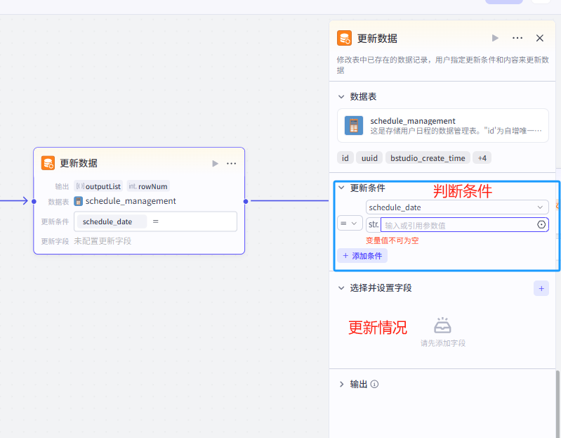 可以看到配置数据表之后,更新数据节点的设置和前面的判断节点-选择器有一些相似