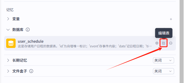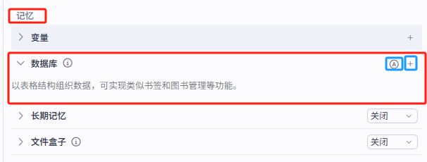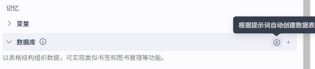 数据库的添加和引入在记忆部分,我们可以选择通过提示词(AI)辅助创建或者直接添加