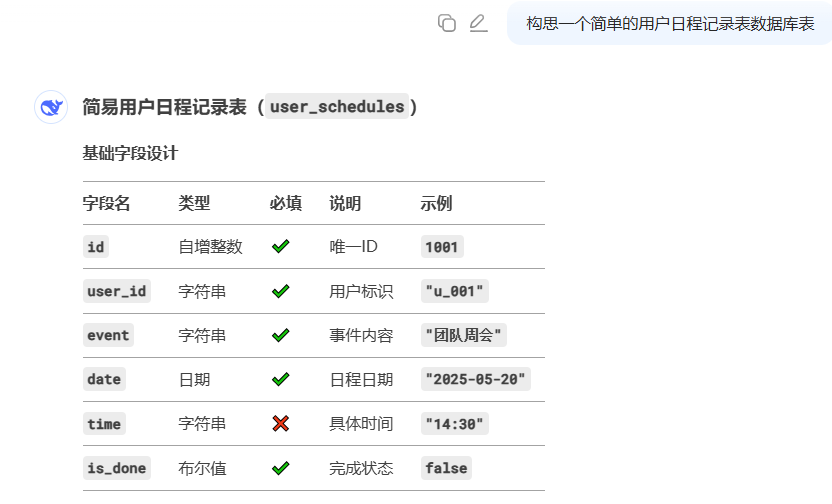 在前文中,DeepSeek给我们生成的数据库表格中涉及到一个字段user_id(用户标识),这就是多用户模式的概念,数据表中的来源存在不同用户源,就是多用户模式,而我们只记录某个用户的日程,属于单用户模式