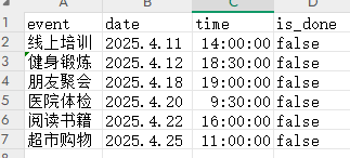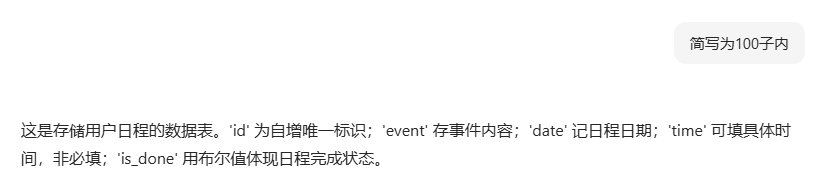 我们的is_done(日程完成状态)也可以使用字符串类型,但是布尔类型就只有两个值:“真”(True )和 “假”(False ),所以我们定义为布尔类型,方便我们去辨别日程的完成情况
