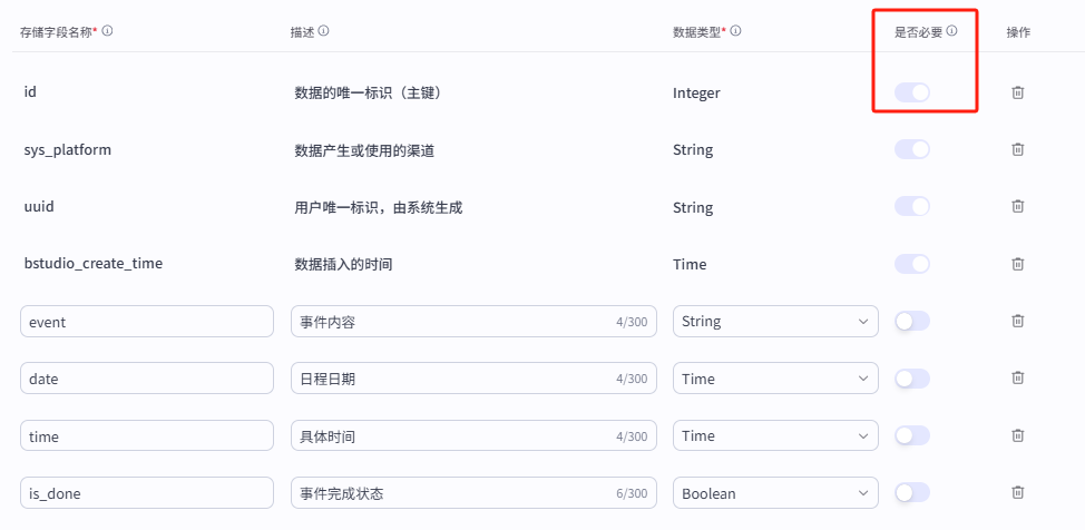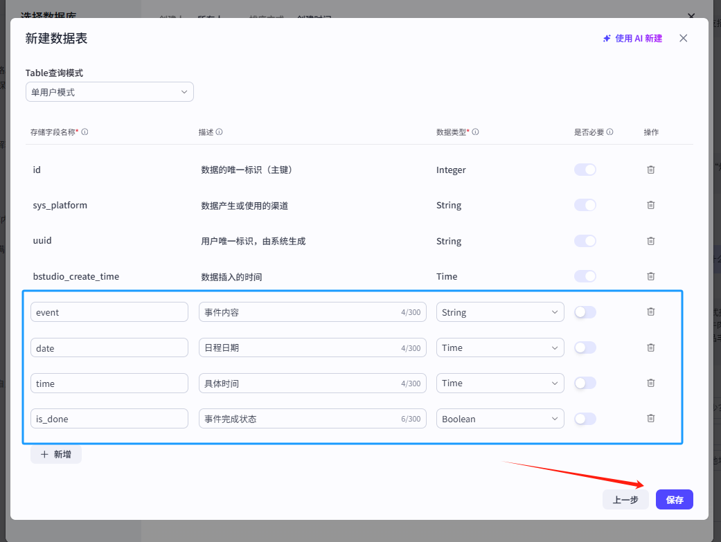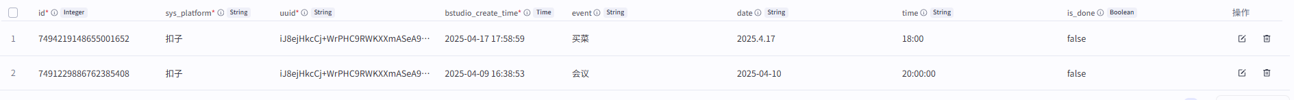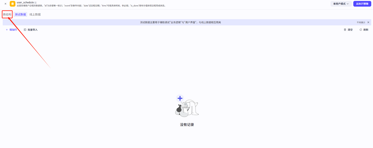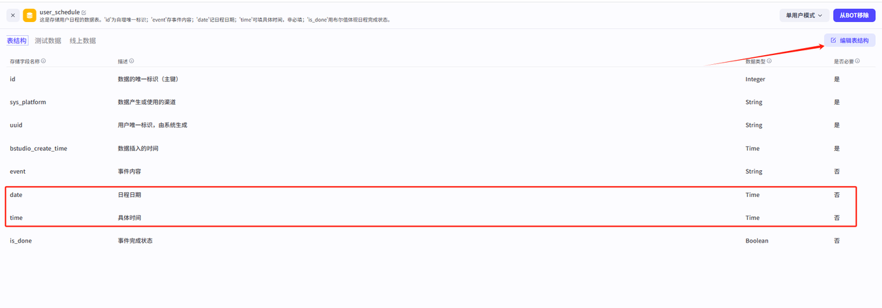 这里需要再说一下,由于我们只需要记录这个使用智能体的X用户的日程,所以生成表格中的用户标识是可以去掉的,这部分在后面的Table查询模式给大家详细介绍为什么
