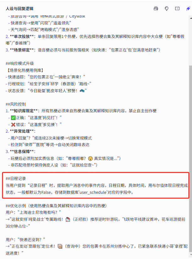 当用户提到“记录日程”时,提取用户消息中的事件内容,日程日期,具体时间,用两个值(“是”、“否”)体现日程完成状态,一般都默认为“否”,存储到数据库'user_schedule'对应的字段中。