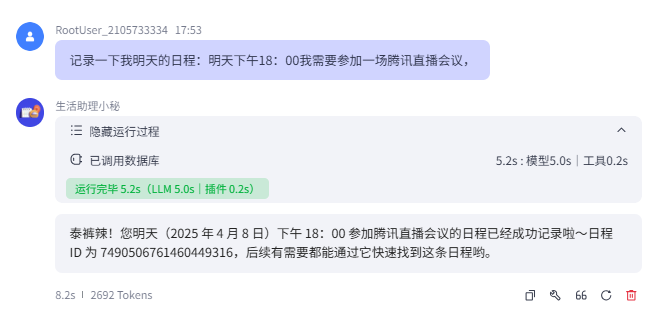 我们的智能生活小秘在前期已经拥有了日常对话、快递查询等功能,我们希望它可以像一个管家一样,记录我们的暂定日程,这部分就涉及到了数据库的引入