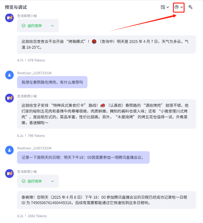 然后再次进行测试,可以看到智能体依旧是显示运行成功的