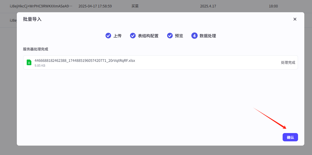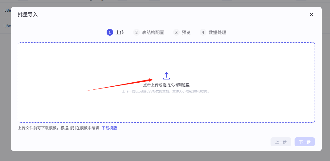点击之后会出现这个弹窗,需要我们上传文件,不过自己制作的表格文件不太符合平台的标准,我们需要下载平台的文件模板