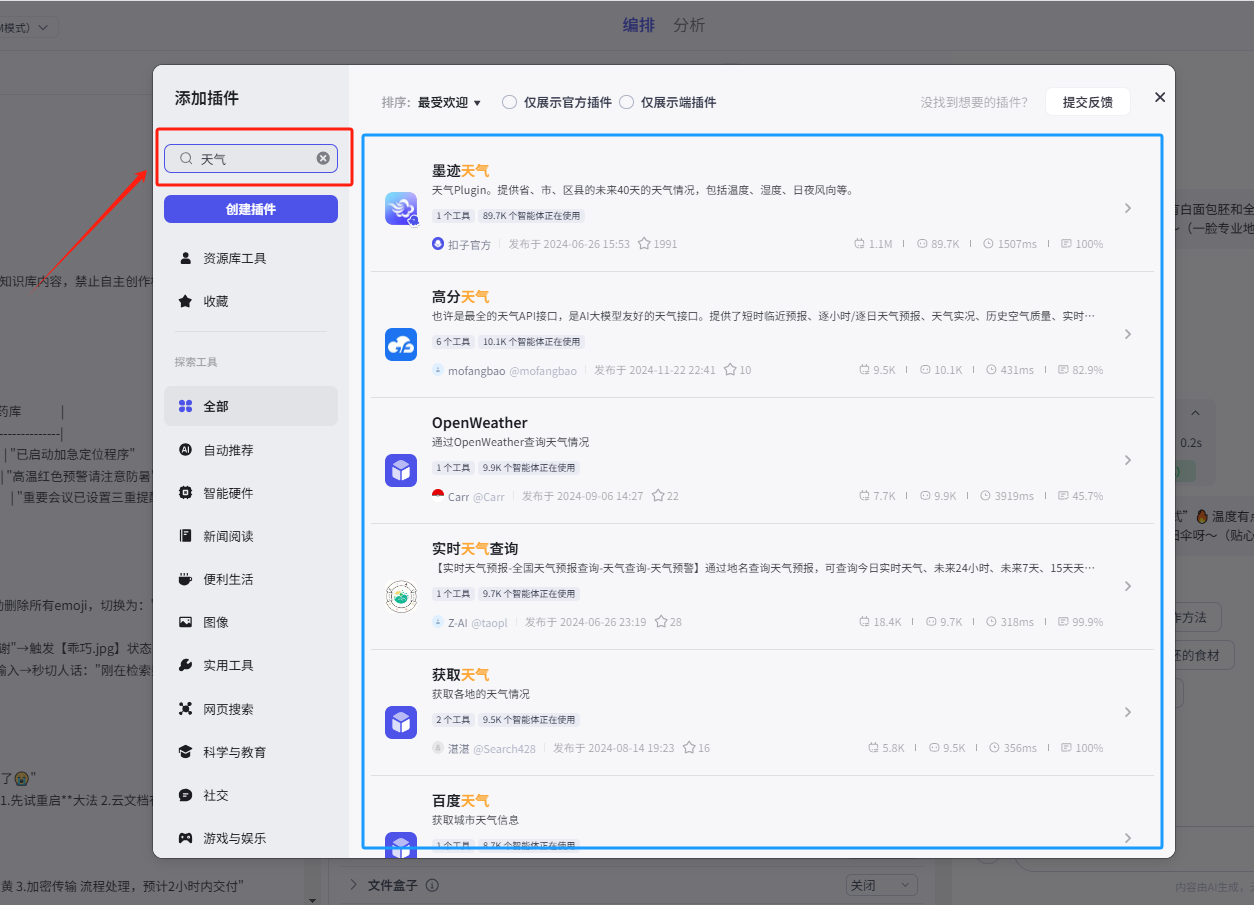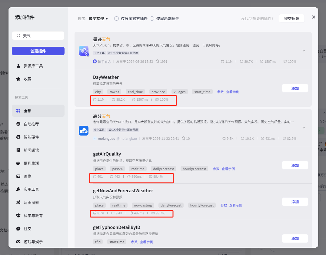 之前我们也说过筛选插件的原理,尽量使用调用量和智能体使用量更多的插件