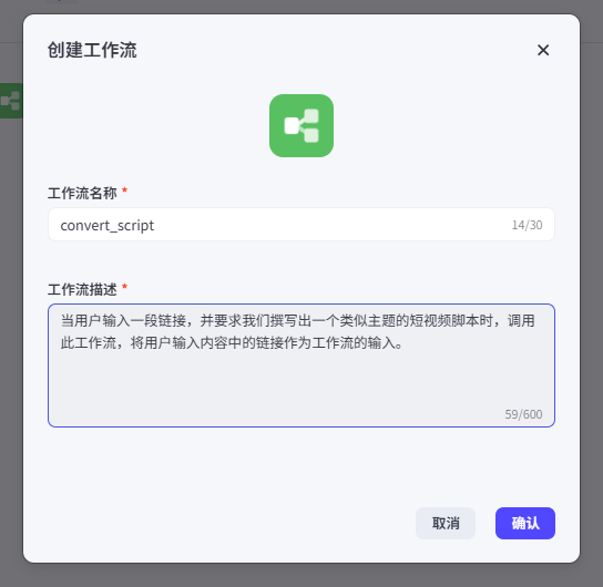 这里的大模型节点规则就不太一样了,因为我们在上一个节点提取的是抖音视频的文案,是一个长文本内容,后面想要将这个长文本作为短视频脚本内容输出为分镜表格