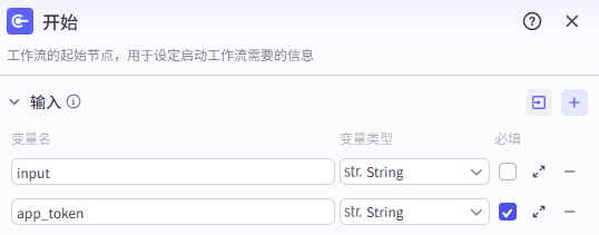 输入有两个必填项,app_token选择开始节点的填入的“app_token”