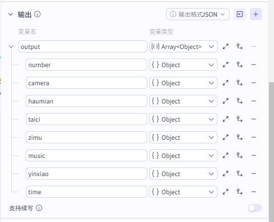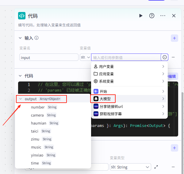 所以大模型的输出是我们根据预期的表头所需的每一个数据,我们使用数组来存储每一行的内容,所以这里选择输出变量的类型为Array-Objet