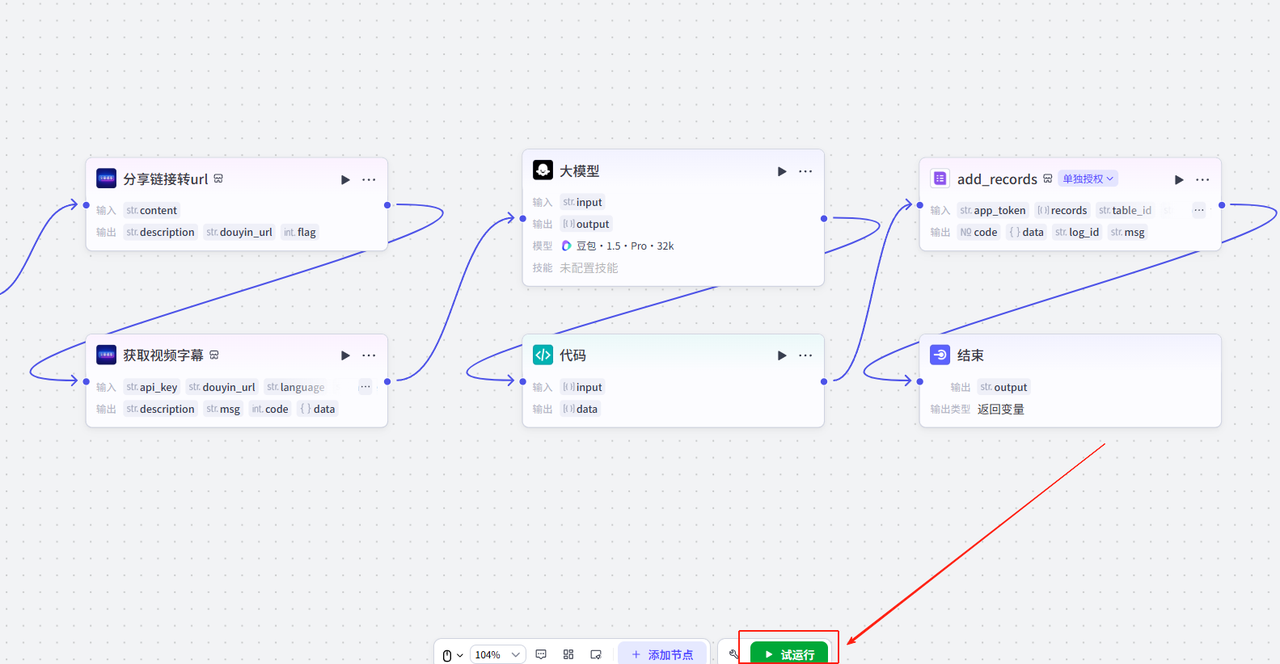 输入飞书多维表格链接和抖音的分享链接,然后再次点击试运行