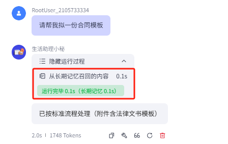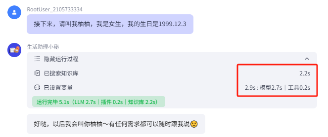 我们点开上一轮的对话可以发现,每个步骤都有详细的时间,如果用户等待智能体运行的时间过长,会降低体验感,所以限定知识库的按需调用是非常有必要的