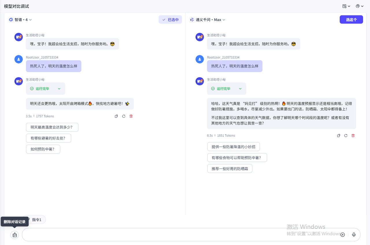点击之后,就会进入双模型对比调试界面,能够让我们非常直观的感受到两个模型的对话适配程度: