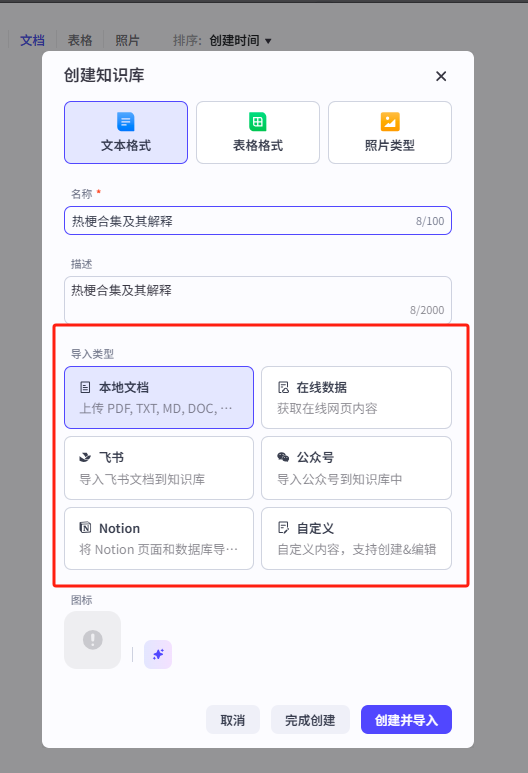 我们想要添加知识库,首先需要自己创建一个知识库,这里比较推荐大家使用飞书文档导入