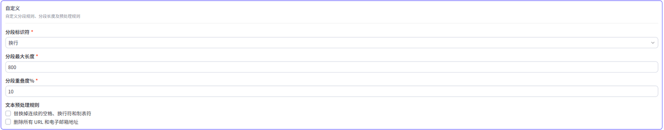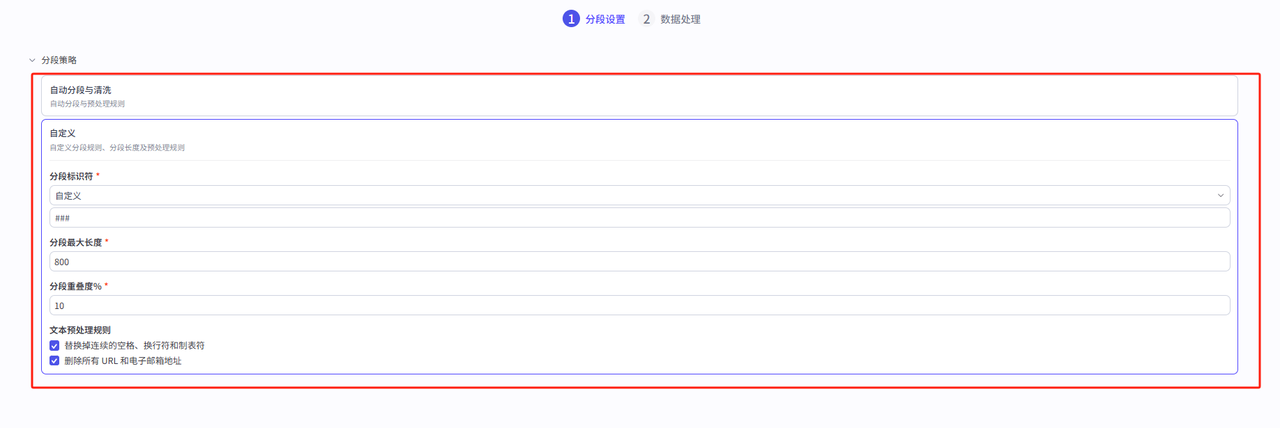 分段最大长度和分段重叠度大家选择默认的即可,这个最大长度是通用的,适用于大部分环境下的知识库文本