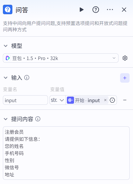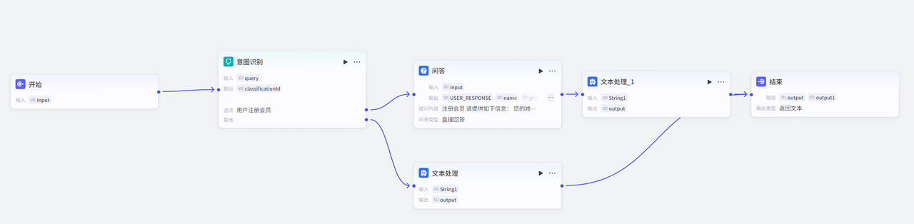 这是个收集用户信息的工作流,如果意图识别节点识别用户发送“注册会员”类的信息,即跳到问答节点搜集用户信息,如果非这类信息则提示用户发送“注册会员”,注册完成提示用户注册成功