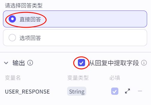 勾选“从回复中提取字段”,这样才会通过大模型收集用户回复中的信息,如果不选择,则默认输出用户的整个回复内容