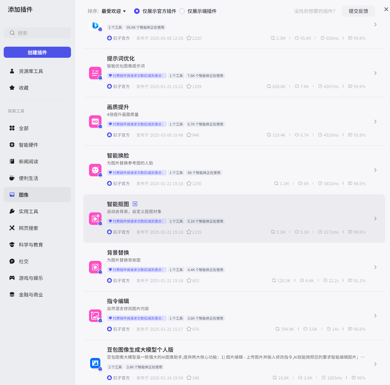 之前我们在 ✍️案例3:公众号文章创作智能体(工作流+图像流)中已经用过了coze工作流中的图像工具,用的是文生图,也用了画板工具,这里给大家介绍更多的图像处理的工具