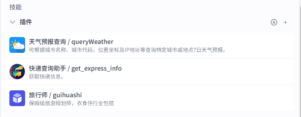 接下来按照前面的操作逻辑再添加快递追踪和行程规划相关的插件和提示词即可