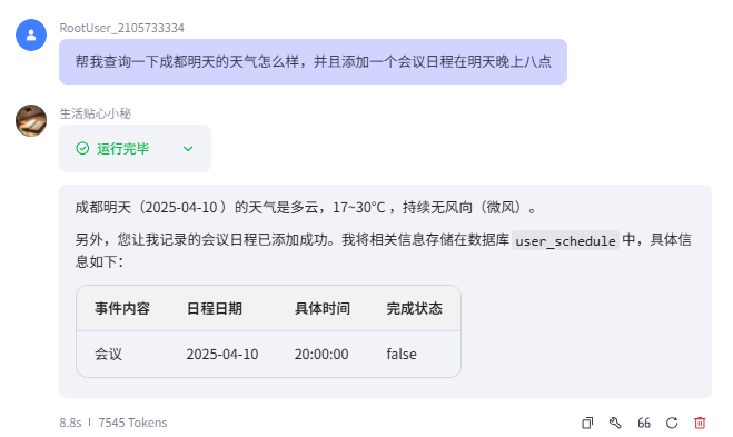 我们向Coze发送查询天气+记录会议日程的要求,可以看到是已经成完成的,大家在测试过程中也可以再添加别的功能看下是否能够完成协同工作的测试