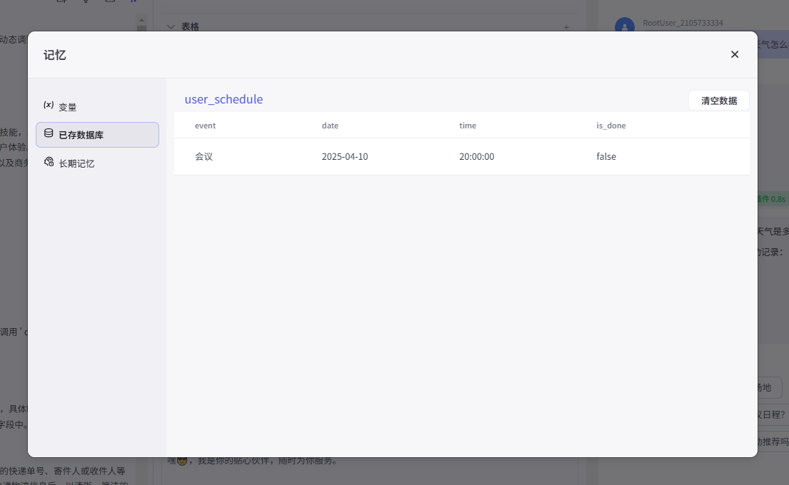 1. 当用户提到“记录日程”时,提取用户消息中的事件内容,日程日期,具体时间,用布尔值体现日程完成状态,一般都默认为False,存储到数据库'user_schedule'对应的字段中。