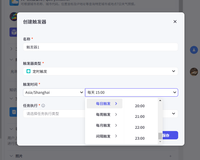触发器是一个特殊的板块,它可以允许你自定义一个时间去发送消息,也可以允许用户在对话中创建定时任务