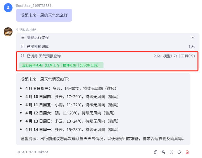 安装 “天气预报查询 ” 插件后,智能体能够根据城市名称、城市代码、位置坐标及 IP 地址等,查询特定城市或地点 7 日天气预报,为用户的出行、活动安排等提供天气信息参考