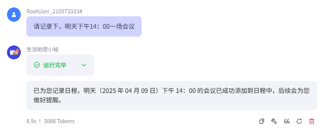 当用户提到“记录日程”时,提取用户消息中的事件内容,日程日期,具体时间,用布尔值体现日程完成状态,一般都默认为False,存储到数据库'user_schedule'对应的字段中。