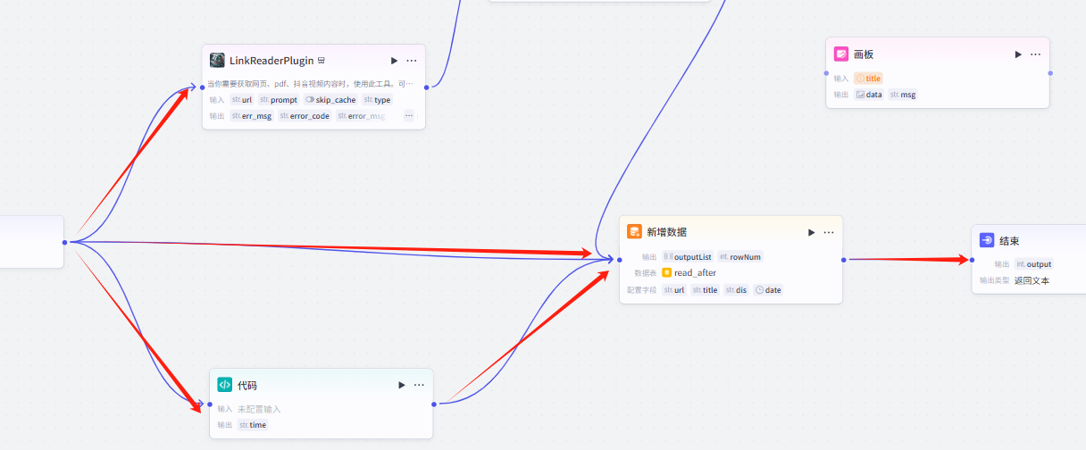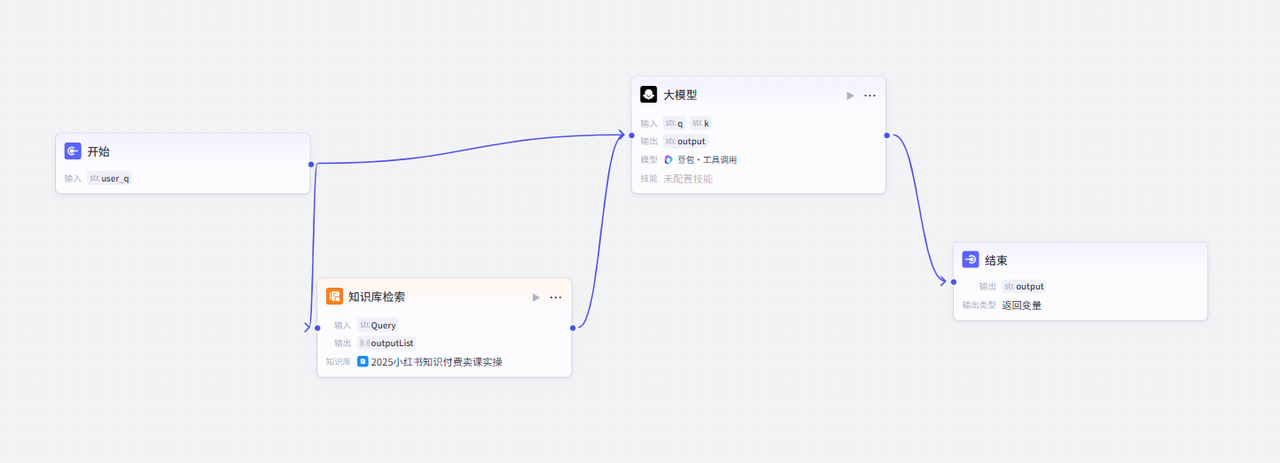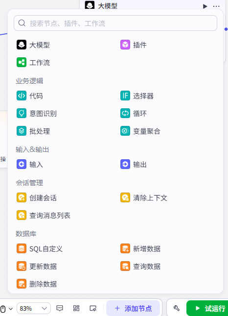 比如开始节点,接收用户的输入,以及后续的一些操作节点,这部分可能会包含大模型、插件、数据库输入输出、知识库检索,甚至是代码块等等