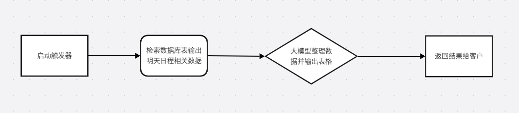 那么我们可以这样构思,使用一个定时触发的调用工作流的触发器,然后启动触发器的时候就调用这个工作流,在工作流节点的设计中,我们启动数据库检索功能,输出比如明日日期的所有日程,然后使用大模型整理为表格输出,再返回到客户