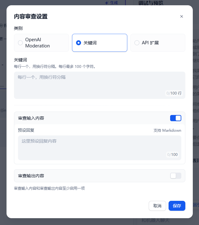 其实概念很简单,就是当输入或输出涉及到这些关键词,聊天助手会向用户发送预设回复