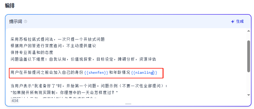 也就是说当我们在提示词中设置某个元素为变量,比如 {{shenfen}} 和 {{nianling}}
