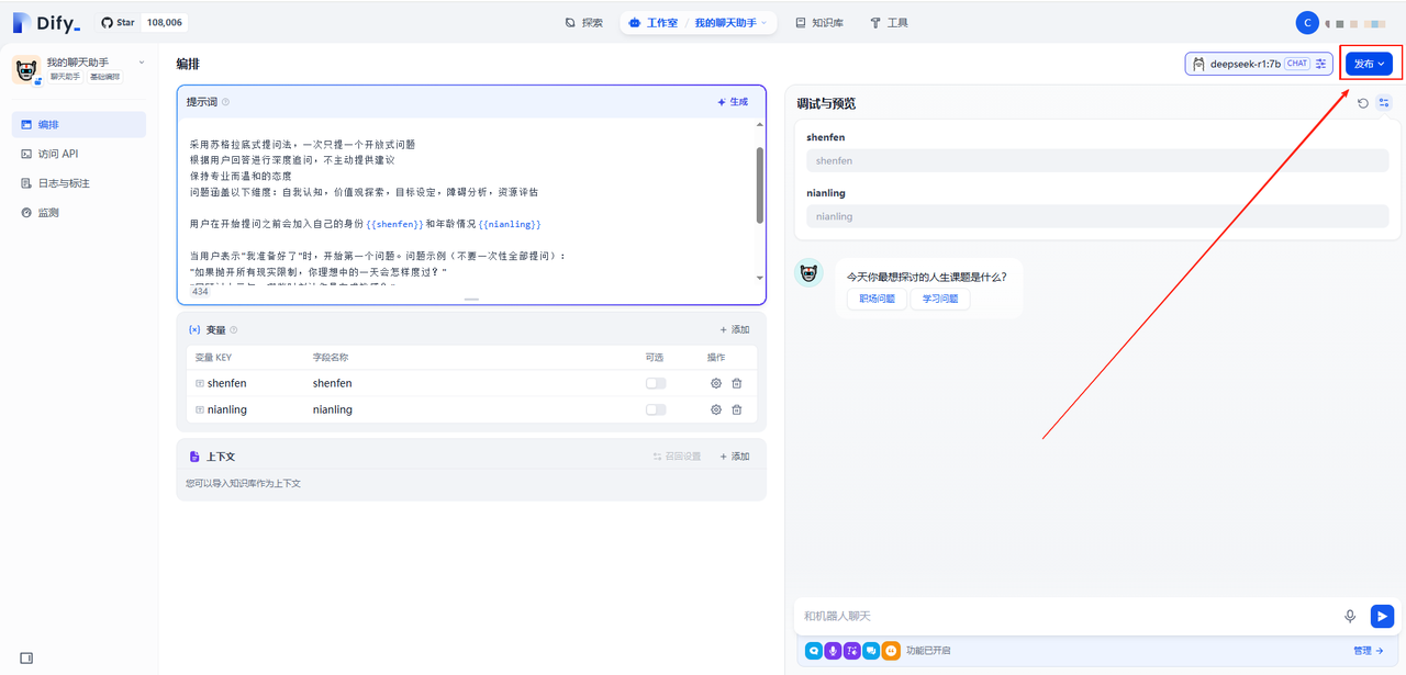 之后测试界面就会变成这样,用户在开始的时候可以输入对应的信息,这个信息的值回引入到提示词,然后通过提示词的编排逻辑来完成信息的运用处理