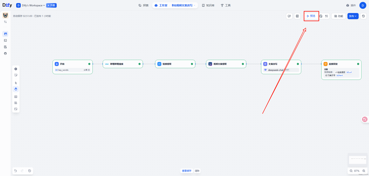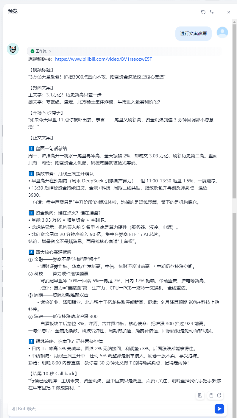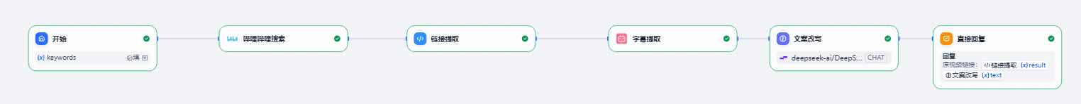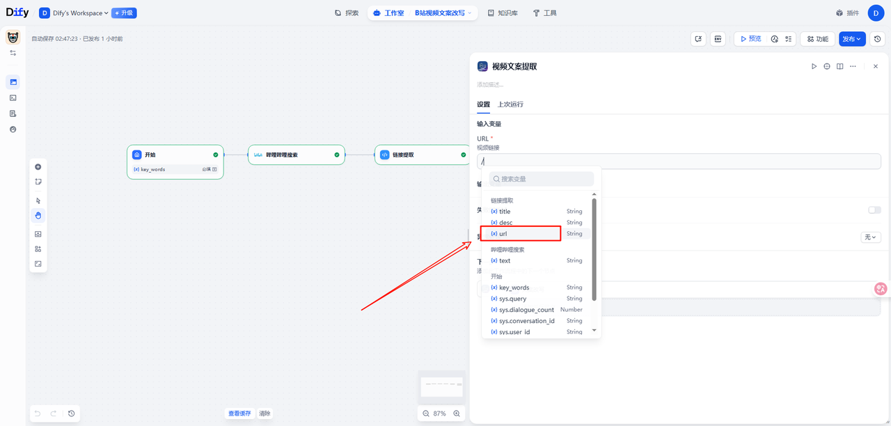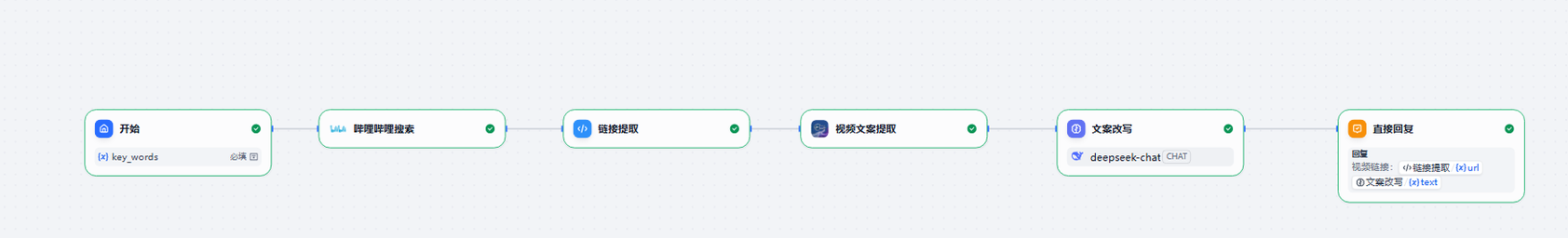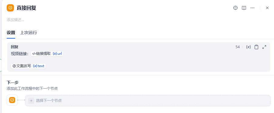直接回复输出“链接提取”的“url” 和 "文案改写"的text变量即可,到这里我们的整个工作流就搭建完成了