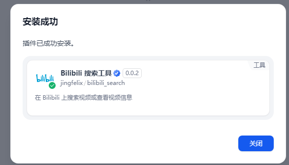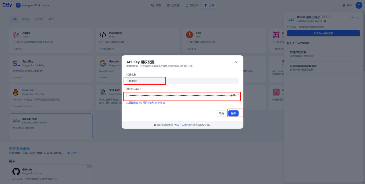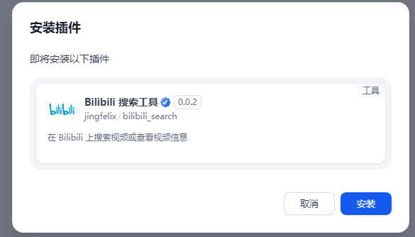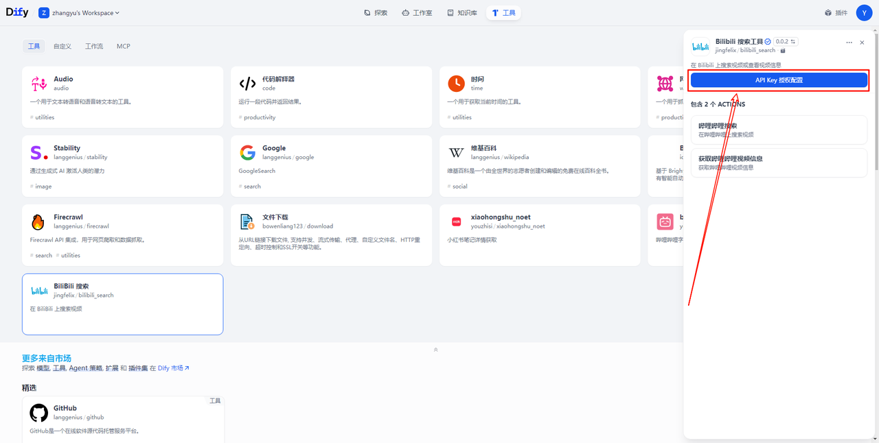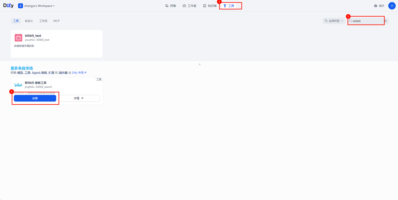 点击dify界面上方的工具,右边搜索bilibili,找到Bilibili 搜索工具的插件,将鼠标移到插件上方将会出现安装,点击安装即可
