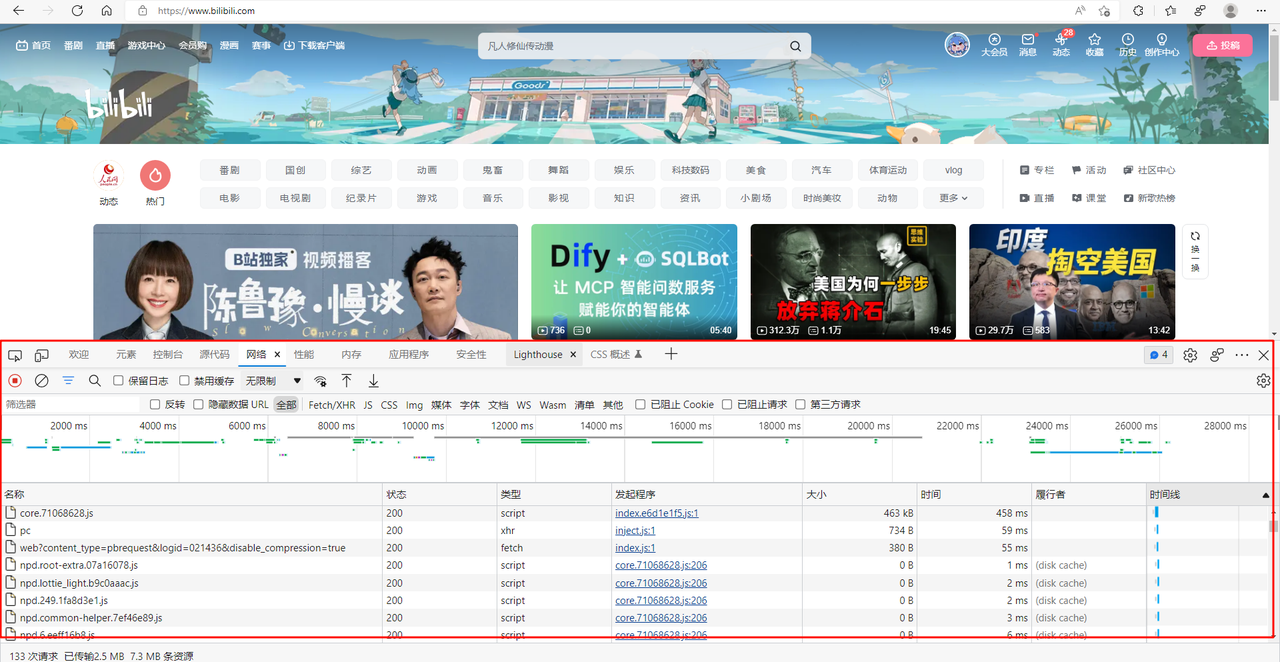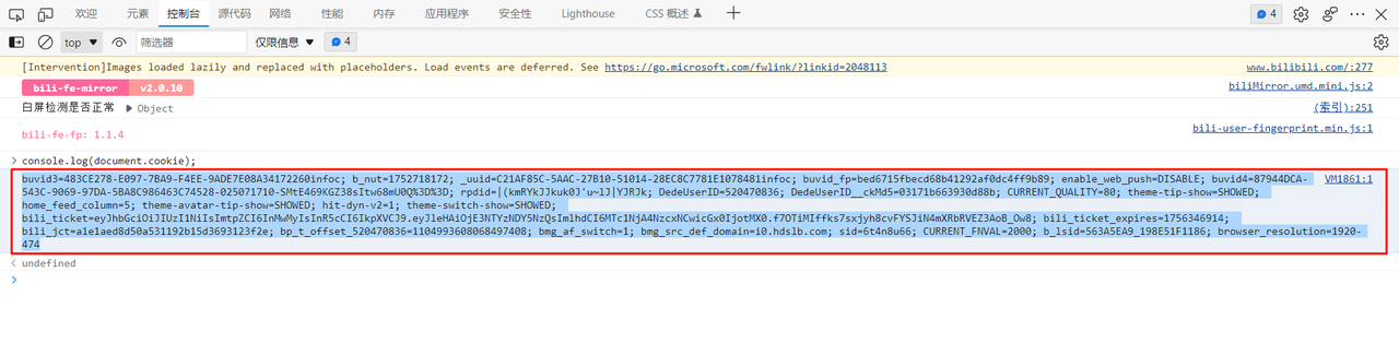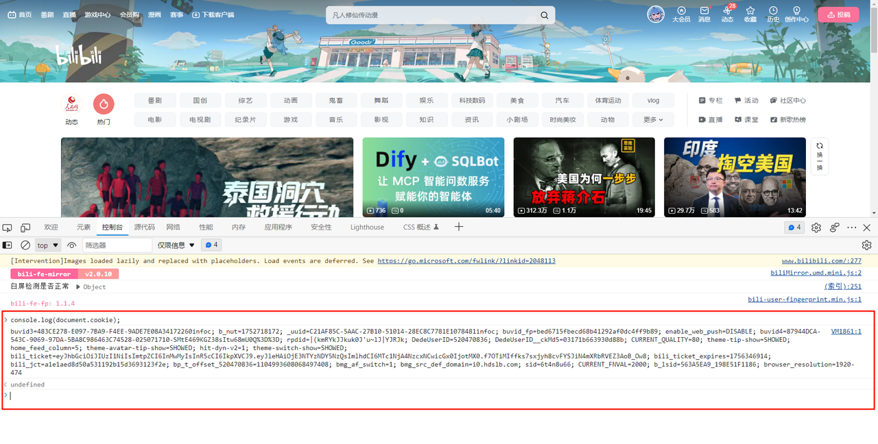 授权需要先进行Cookie获取,在你的浏览器中登录您的 Bilibili 账号,打开浏览器的开发者工具(按下 F12 键)就会出现下面界面,可能在下边或者右边