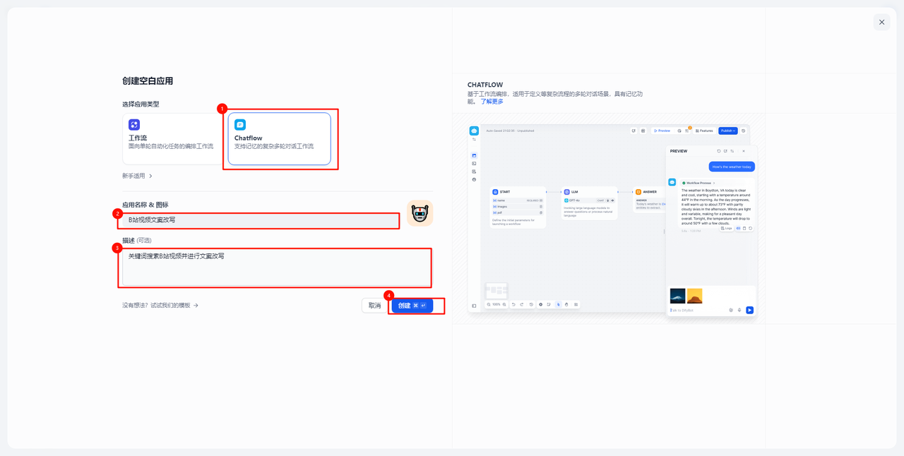应用类型就选择Chatflow,然后依次填入应用名称和描述,点击一下创建