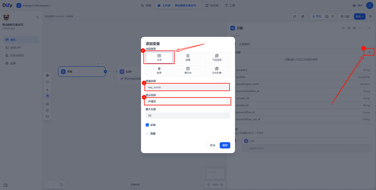 在开始节点我们需要配置关键词的输入变量,点击右侧变量的“+”,选择字段类型:文本,变量名称:key_words,显示名称:关键词,最大长度:48,勾选必填,最后点击保存即可
