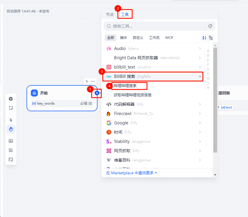 在开始节点后添加哔哩哔哩搜索节点:在点击添加节点后选择工具——>BiliBili搜索——>哔哩哔哩搜索