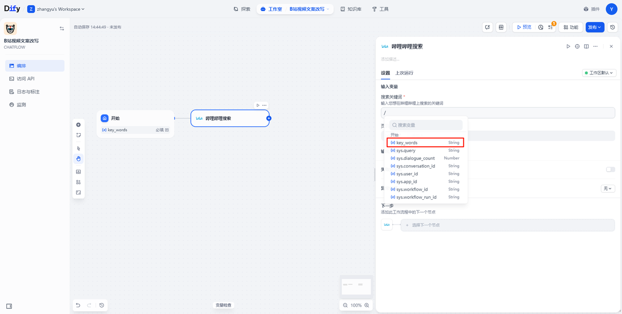 对节点的搜索关键词进行添加,选择开始节点的key_words,如果提示未授权的话请参考插件配置:授权配置