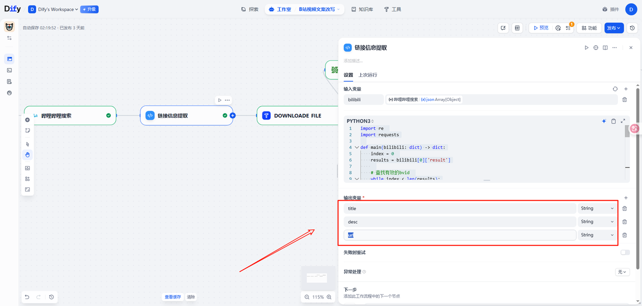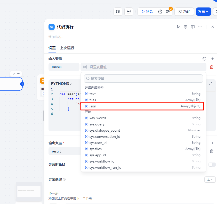 代码节点配置:输入变量:哔哩哔哩搜索的json,变量名称:bilibili
