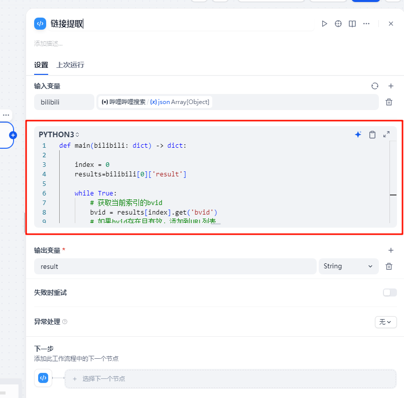 添加代码执行节点,可以修改名称为“链接提取”,方便后面节点输入